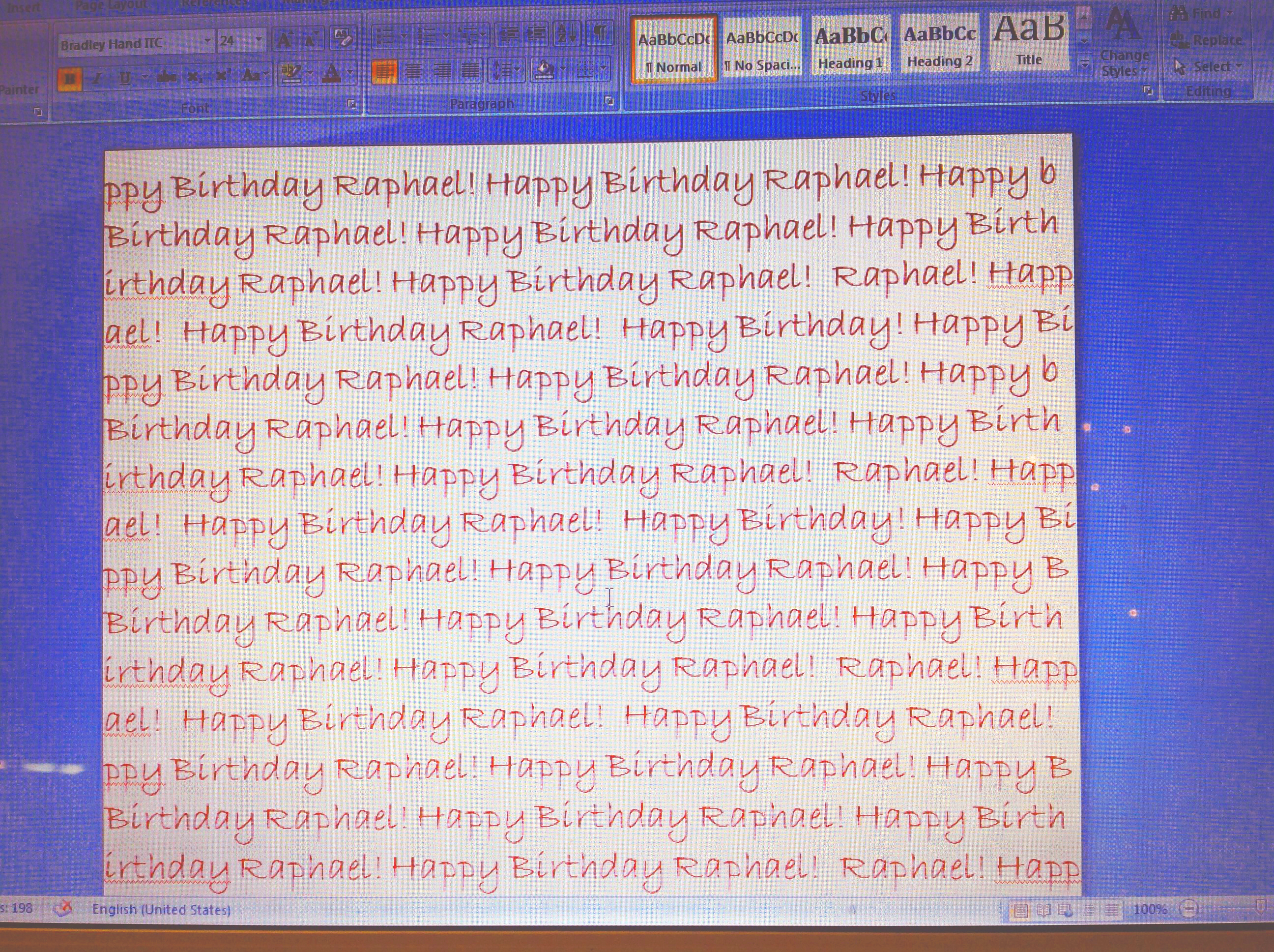 I wrapped each cookie individually into square pieces of parchment paper (8 1/2 inches – about 22 cm). I made crisp folds on the four sides, tied my little package with some twine and made a small bow. The cute birthday note was made on the computer by typing a repeating message that starts at a different point at the beginning of each line. I took off the right, left upper and lower margins so as to widen the space for my text and use less paper. I typed 3-4 lines and then copy-pasted them on the rest of the page.