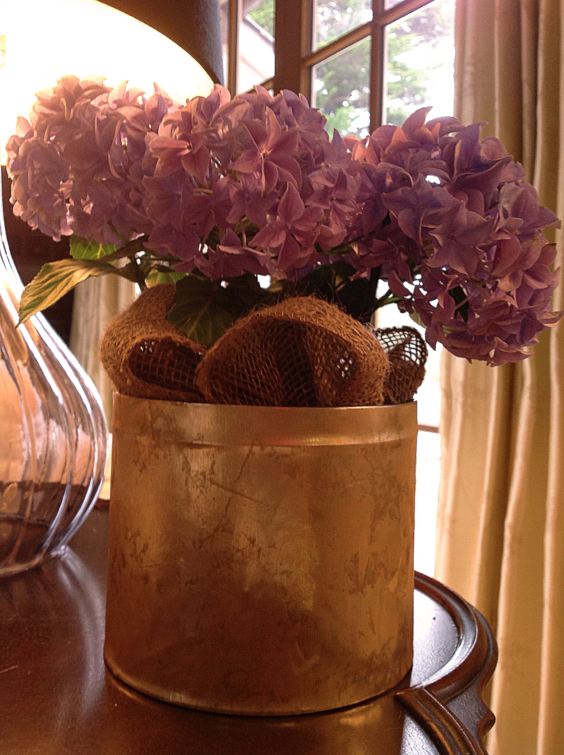Oh, and by the way, this is how I made the cute little cache-pot for the super-market-bought-purple-hydrangea-into-a-black-plastic-pot that’s on my side table: